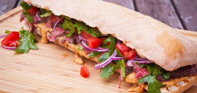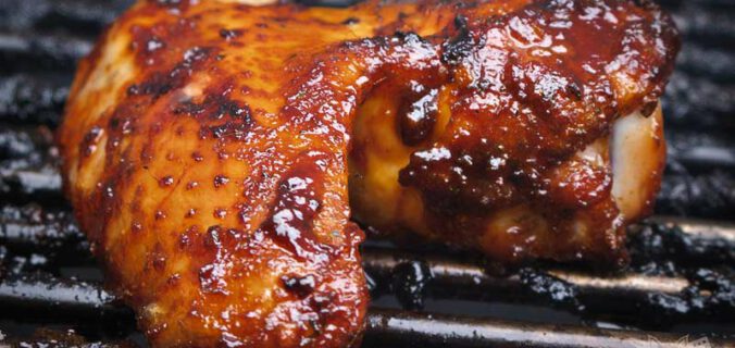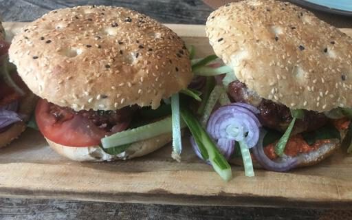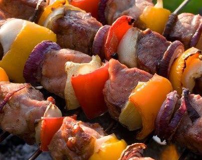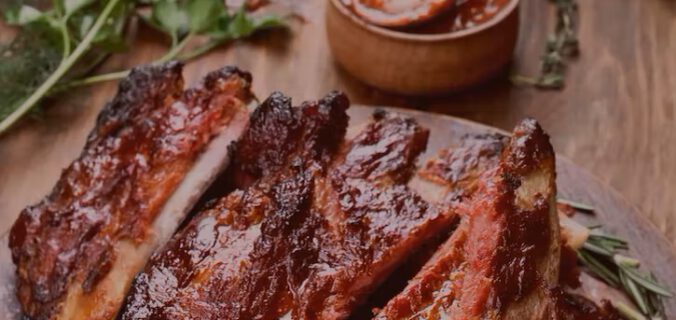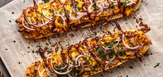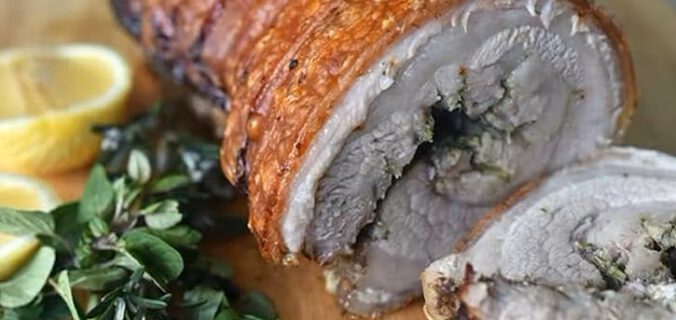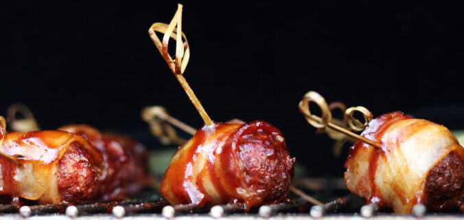 In ham verpakte varkenslapjes met aardappel en rode ui