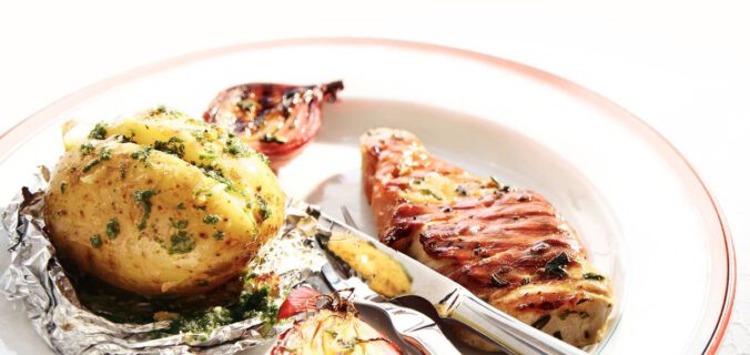 In ham verpakte varkenslapjes met aardappel en rode ui