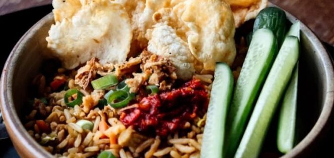 Bak (in een aparte pan) van 4 eieren een roerei. Meng het roerei door de rijst.