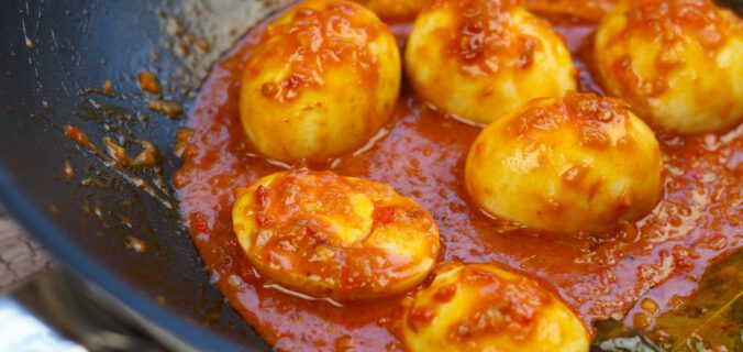 Voeg 1 blikje tomatenblokjes, ½ eetlepel groentebouillonpoeder, 100 milliliter kokosmelk en 1 eetlepel ketjap manis toe. Leg de eieren erin en laat het staan op zacht vuur. Als je de saus te dik vindt, verdun deze dan met een beetje (2-4 eetlepels water).