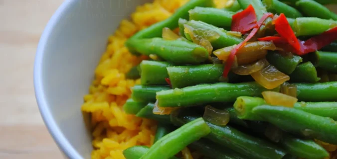- Laat dit 20 minuten stoven tot de boontjes zacht zijn. Ze mogen nog wel een bite hebben. Breng op smaak met zout en peper. Serveer met rijst en gebakken uitjes en extra sambal.
